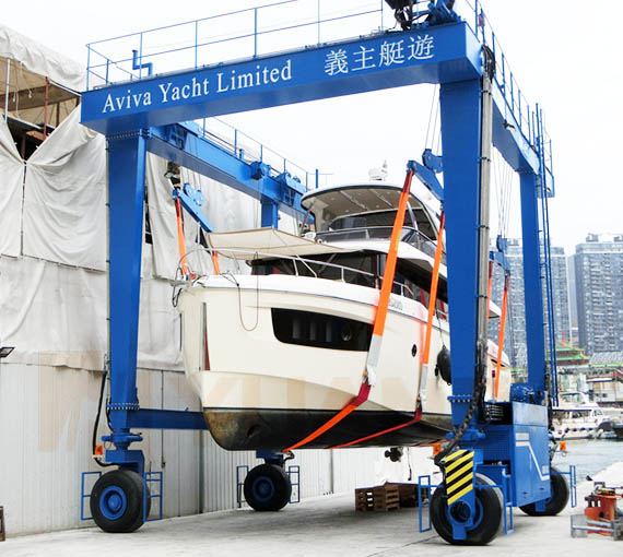 Mobile travelift marine boat hoists, also called travellift boat hoists, boat lift hoists and boat cranes, are designed to lift boats, ships, vessels, yachts out of the water, used in small marinas, river shipyards, dock, quay, yacht clubs, offshore and maintenance center to hoist boat. The lift capacity ranges from 30ton 50 ton 60ton up to 100ton 200t 300ton.